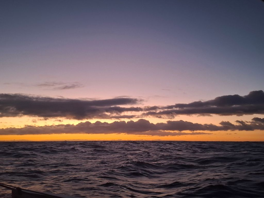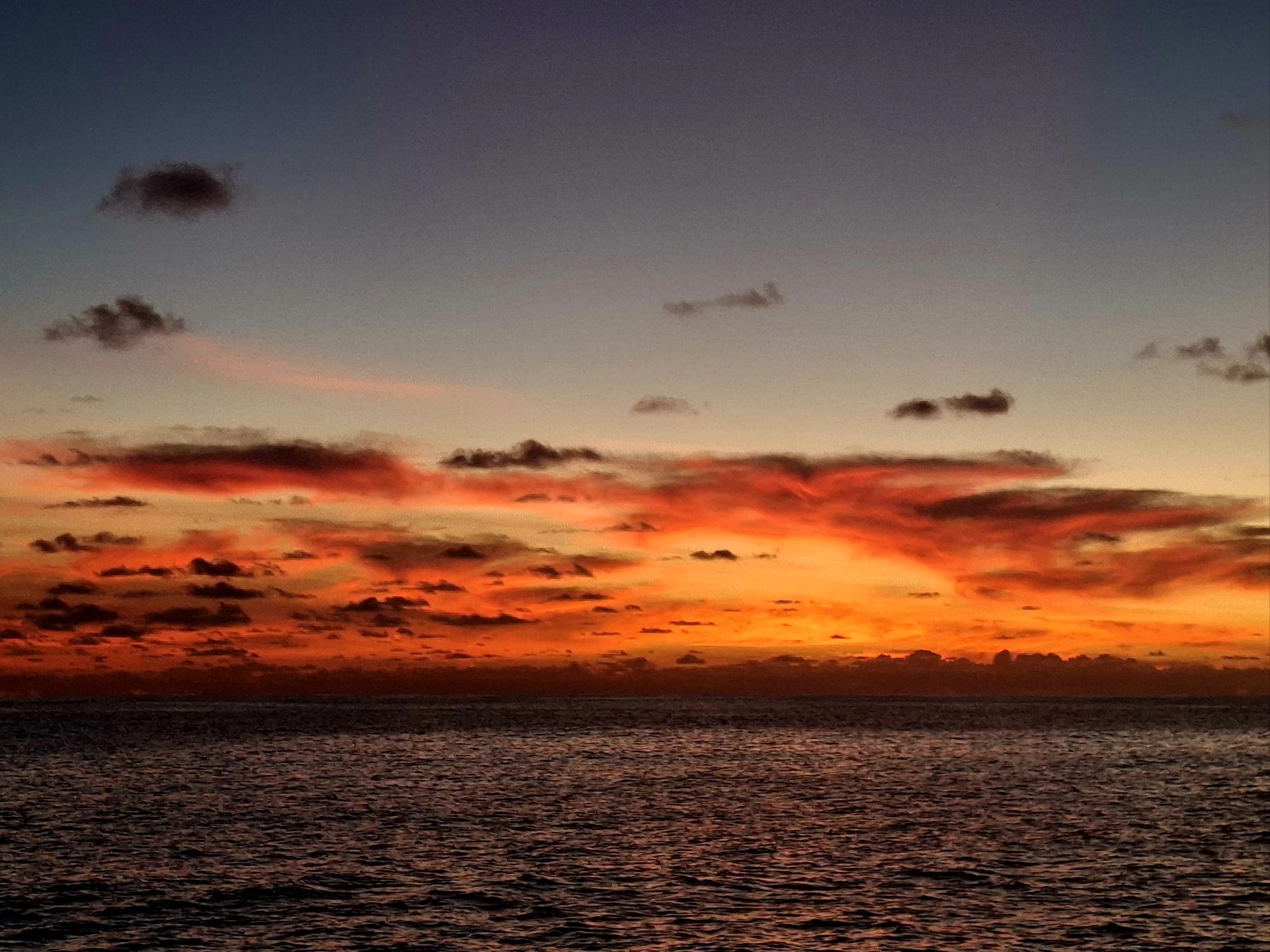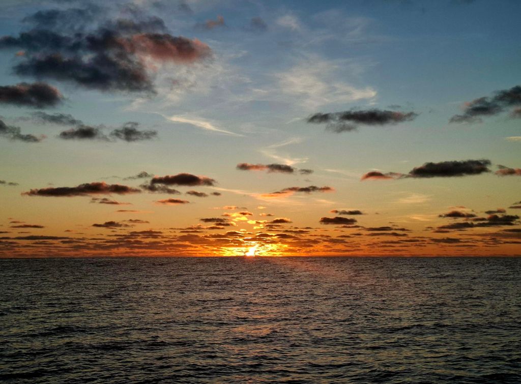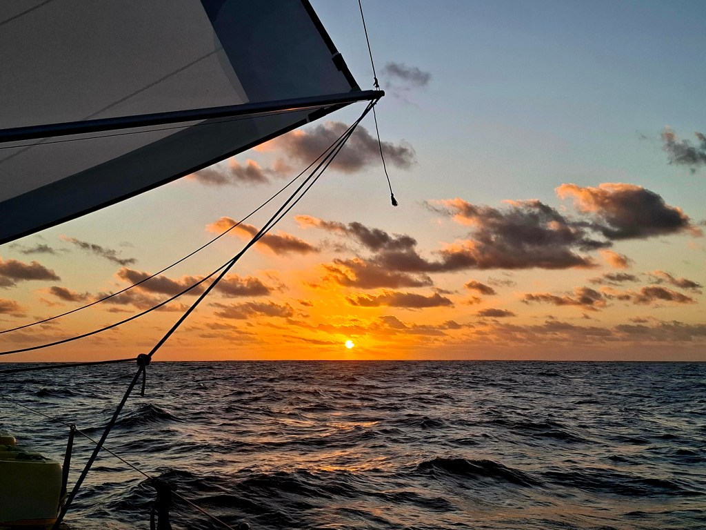 Vers 17h, la lumière se pare de toutes ses dorures. Lorsque la mer le permet, je me place debout à l’avant du bateau, les mains enserrant le génois. L’apaisement est total, la planète me sourit. Petit à petit, le coucher du soleil investit le ciel. Pendant plusieurs heures, il mélange les couleurs, peint en différentes teintes avant que le noir n’avale tout alentour. C’est un spectacle chaque soir renouvelé, débordant de magie. Enfin, les premières étoiles pointent dans le ciel. Un nouveau cycle suit et la vie se poursuit.