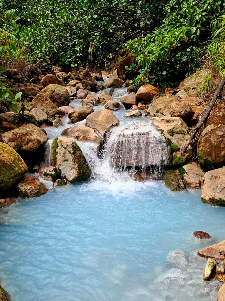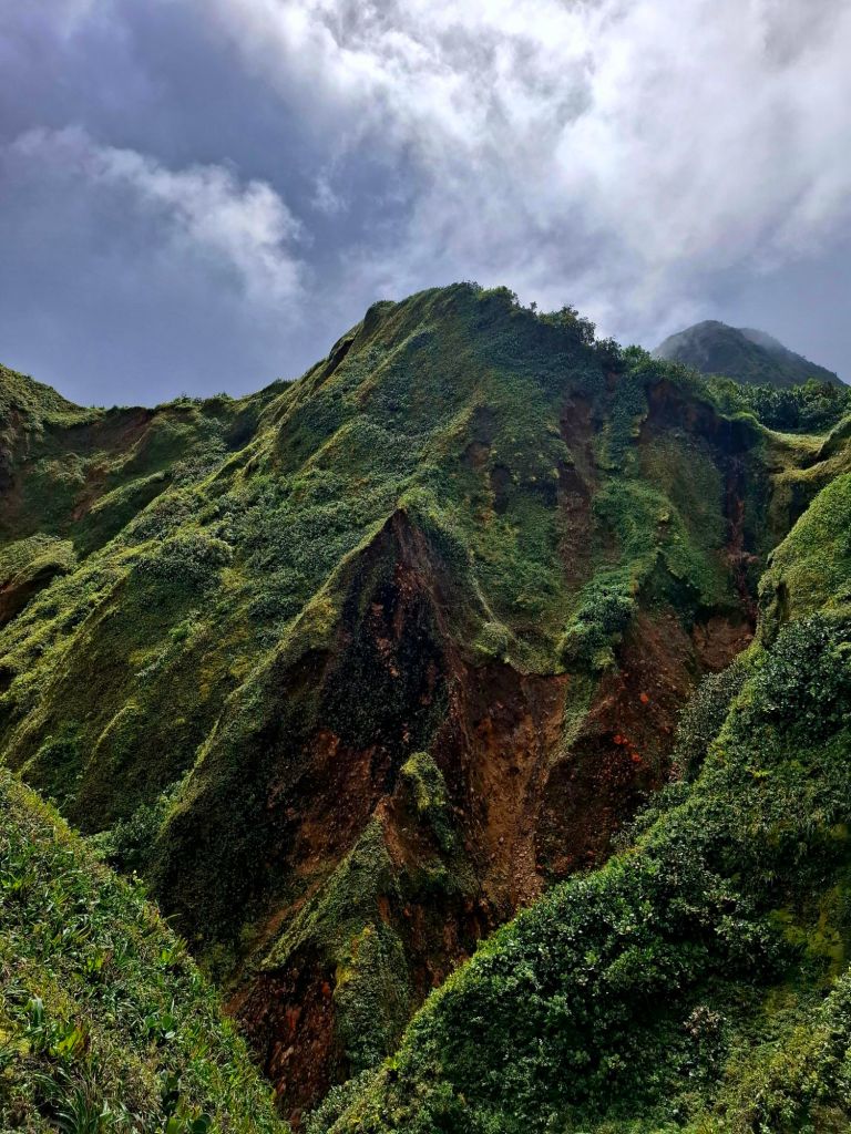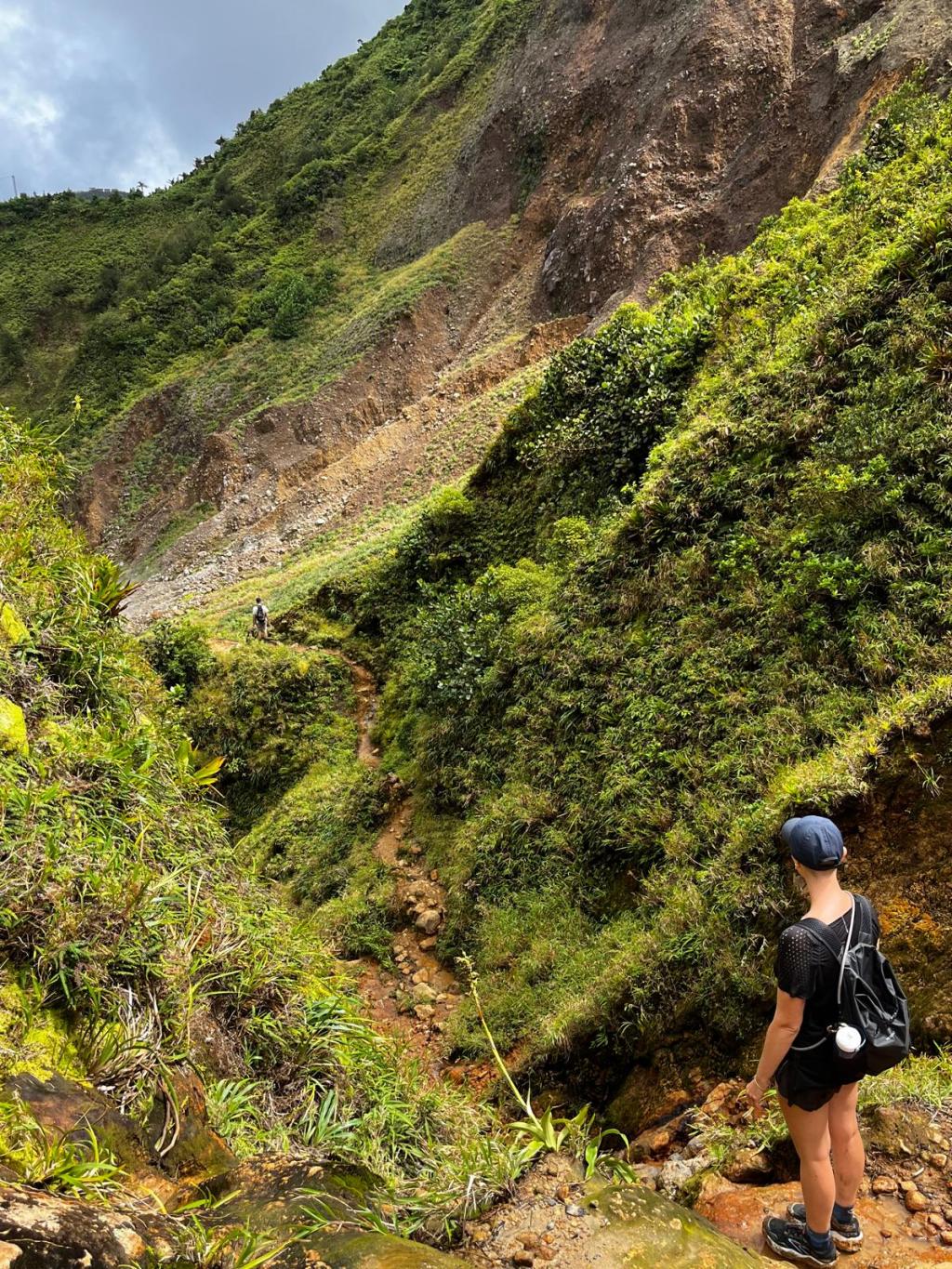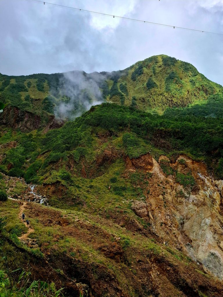 Le troisième jour, nous rejoignons le sentier de la randonnée du Boiling Lake. Arrivé·es sur place, un guide n’est pas seulement recommandé, il nous est imposé. Après 5h d’une magnifique randonnée à travers la jungle d’abord, les flancs de montagne ensuite, une rivière aux reflets irréels enfin, nous atteignons le lac et ses bulles nettement plus imposantes que celles de la veille. En son centre, elles bouent à plus de 400 degrés. On les aperçoit à travers la fumée qui entoure le lac en contrebas. Il nous faudra seulement 2h pour rejoindre notre point de départ ; celui qui freinait notre rythme à l’aller avait rebroussé chemin avant les descentes boueuses et escarpées de la randonnée.